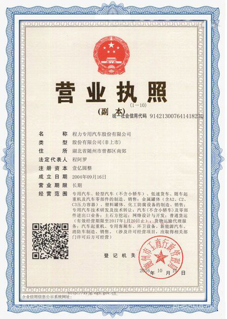 程力專用汽車股份有限公司各類專用汽車的專業廠家,大型專用汽車廠。國內園林綠化、石油化工、市政環衛、壓力容器專用汽車商。注冊“程力威”牌,產品代碼:“CLW”。東風、解放、福田、重汽、陜汽、北奔等公司的重要合作伙伴,主要從事各類專用汽車的業務,同時也銷售各大型廠家的整車及配件。公司擁有自行出口權,其主導品種有灑水車系列、吸污(吸糞)車系列、垃圾車系列、掃地車系列、油罐加(運)油車系列、高空作業車系列、清障車系列、隨車吊系列、自卸車系列、教練車系列、半掛車系列、化工車系列、消防車系列、廂式(冷藏車)系列、牽引車系列、粉粒物料車系列、攪拌車系列、壓力容器系列、專用車配件等十八大系列300多個品種車型。同時批發東風、解放、楚風各種二類底盤。